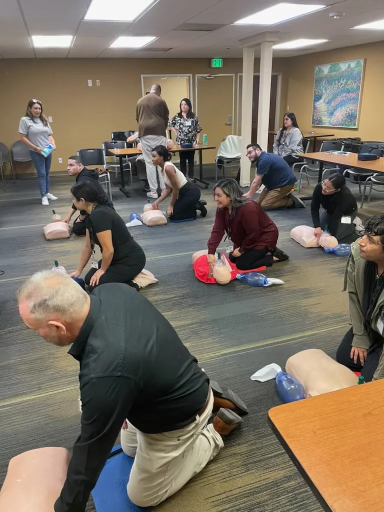 Group of people participating in a CPR training session, practicing chest compressions on mannequins in a classroom setting.