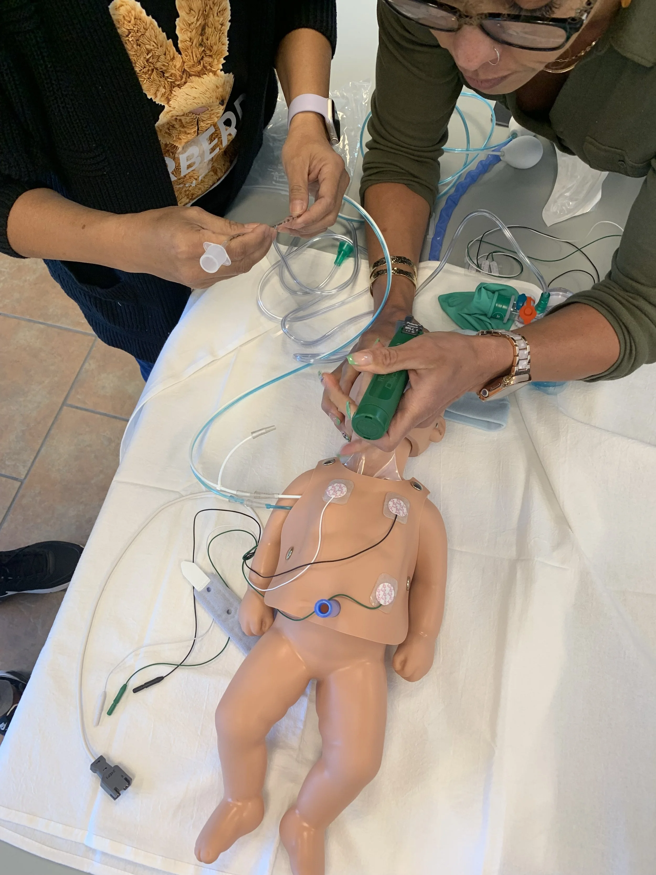 Three people practicing medical procedures on a manikin, using medical equipment and devices on a table.