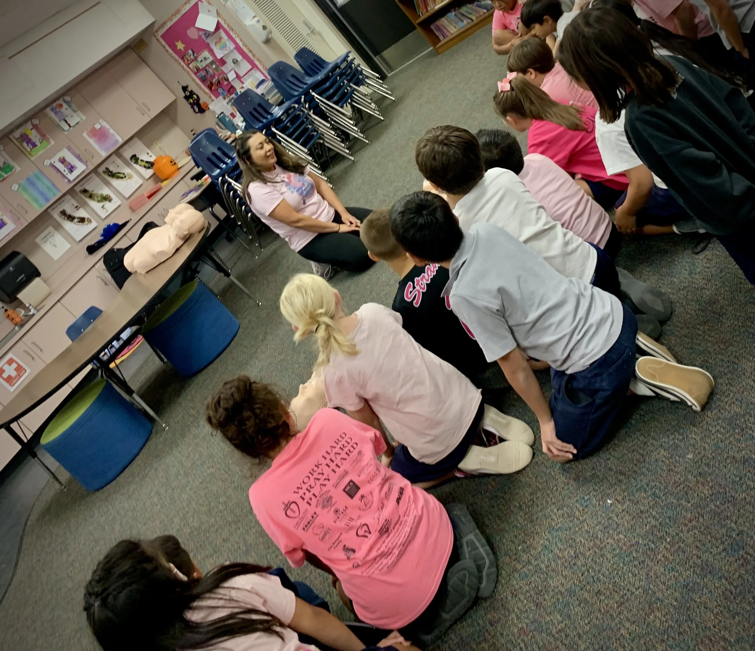 A group of children and adults gathered around a woman sitting on the floor, she appears to be giving a demonstration on first aid, with a mannequin lying on the floor used for training, in a classroom or library setting.